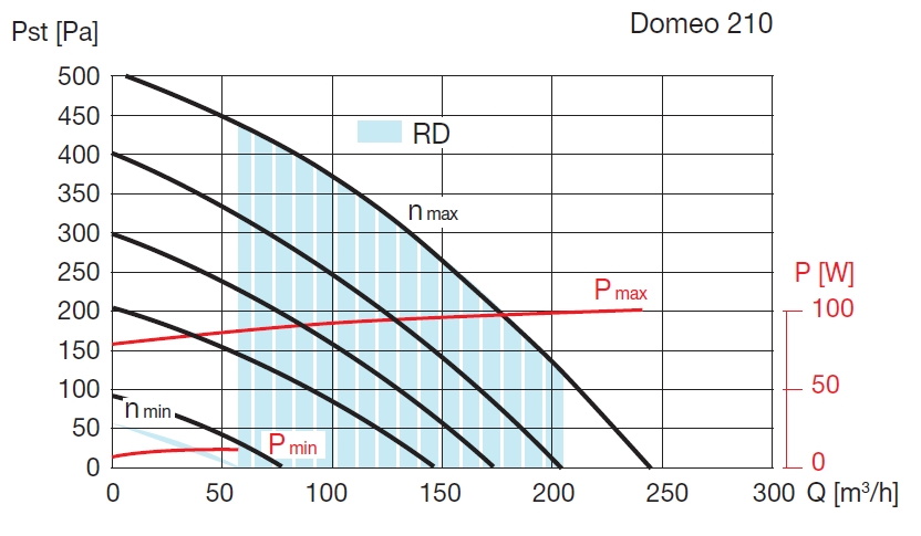 | max. průtok při 100 Pa [m3/h] | příkon [W] | napětí [V] | akustický tlak* [dB(A)] | max. účinnost [%] |