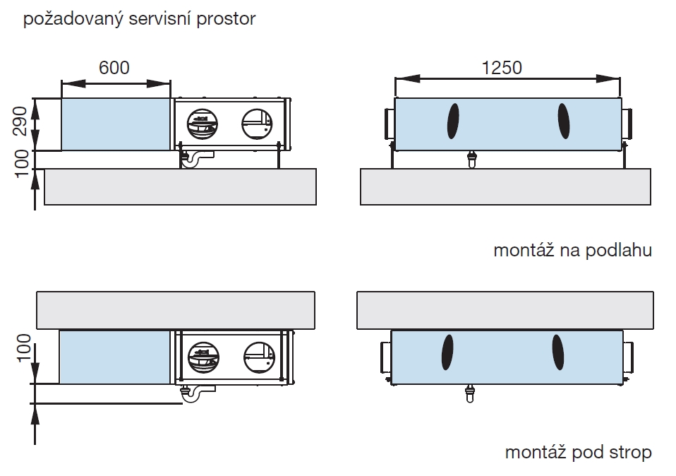 ![]() | Montáž Jednotka je určena k horizontální montáži do vnitřních prostor, pod strop nebo na podlahu. Požadovaná teplota okolí je v rozmezí 0° až 45 °C. Jednotka musí být namontována tak, aby byl zajištěn dostatek prostoru pro otevření víka jednotky, výměnu filtrů, připojení odvodu kondenzátu na odpad se sifonovým pachovým uzávěrem a pro provádění periodických revizí elektroinstalace. | |