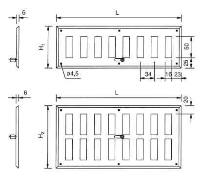![]() | Informace HSO je nastavitelná mřížka na dveře a vzduchovody. HUS je pevná vnější žaluzie určená k montáži jako protikus k HSO. Mřížky HSO a HUS jsou používány na dveře a vzduchovody jako vnější mřížky pro přívod a odvod vzduchu a jsou vyrobeny z ocelového galvanizovaného plechu. Instalace Gravitační mřížky se instalují do stavebně připravených otvorů ve stavebních konstrukcí nebo do výřezů v dveřních křídlech. Montáž je přišroubováním samořeznými šrouby. Montážní otvor: L-36 x H1 - 36, H2 - 36. Výběr mřížky Vhodná rychlost vzduchu na průtočnou plochu je 1,5–2 m/s. Příklad provedení objednávky: HSO - 400 x 100 Výrobek - velikost | |