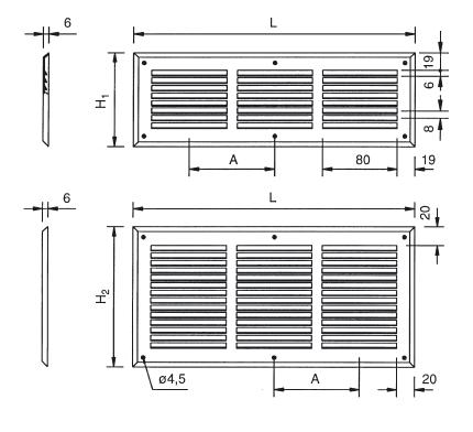 ![]() | Informace HSO je nastavitelná mřížka na dveře a vzduchovody. HUS je pevná vnější žaluzie určená k montáži jako protikus k HSO. Mřížky HSO a HUS jsou používány na dveře a vzduchovody jako vnější mřížky pro přívod a odvod vzduchu a jsou vyrobeny z ocelového galvanizovaného plechu. Instalace Gravitační mřížky se instalují do stavebně připravených otvorů ve stavebních konstrukcí nebo do výřezů v dveřních křídlech. Montáž je přišroubováním samořeznými šrouby. Montážní otvor: L-36 x H1 - 36, H2 - 36. Výběr mřížky Vhodná rychlost vzduchu na průtočnou plochu je 1,5–2 m/s. Příklad provedení objednávky: HSO - 400 x 100 Výrobek - velikost | |