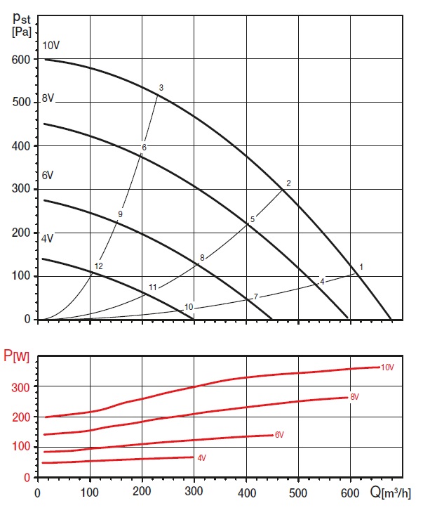 ![]() | Regulace V tabulce a grafu jsou znázorněny možnosti nastavení otáček. Ty lze po montáži přizpůsobit dle potřeby. Vzdálený ovladač je vybaven čtyřmi potenciometry, kterými lze nastavit hodnotu průtoku standardního, zvýšeného nebo vychlazovacího režimu v letním období. Poslední potenciometr slouží pro nastavení režimu větrání – rovnotlaký, přetlakový nebo podtlakový režim. K dispozici je volitelný LCD panel TSP-A, který navíc umožňuje nastavení týdenního programu. Jednotka má analogový vstup 0–10 V a je možné ji řídit od externího analogového čidla CO2, vlhkosti nebo teploty. | |
