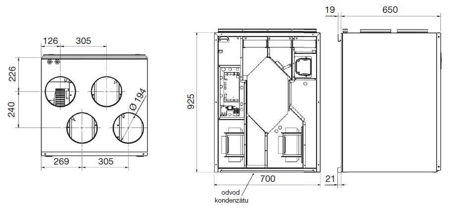 ![]() | Skříň Skříň je z bíle (RAL 9003) lakovaného pozinkovaného ocelového plechu. Konstrukce je tvořena sendvičovými panely o tloušťce 25 mm, s nízkými tepelnými ztrátami. Hrdla (Ø 160 / 200 mm) jsou umístěna na horní části skříně. Plně automatický obtok výměníku (by-pass) je standardně součástí jednotky. Jednotka je vybavena řídicím systémem, který indikuje znečištění filtrů, ovládá by-pass a umožňuje spuštění funkce zvýšeného provětrávání (BOOST) nebo pohotovostního režimu. | |