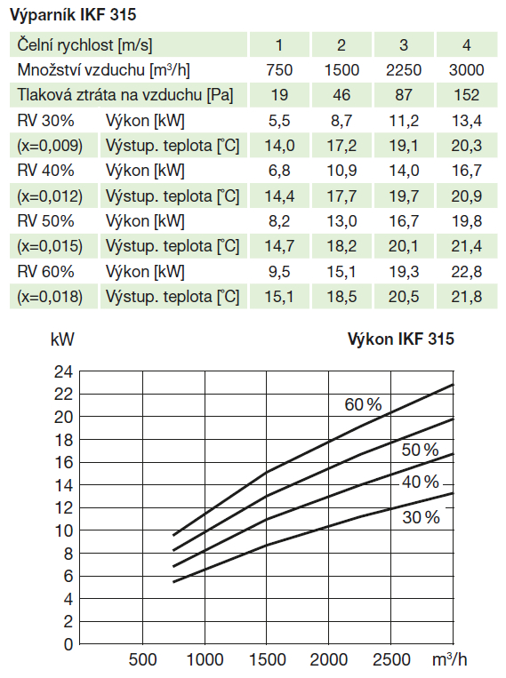 výparná teplota chladiva (výpočtová) 5 ˚C, max. čelní rychlost vzduchu 4 m/s, hodnoty výkonu platí pro přívodní vzduch 32 ˚C, RV 40%, chladivo R410 a R32