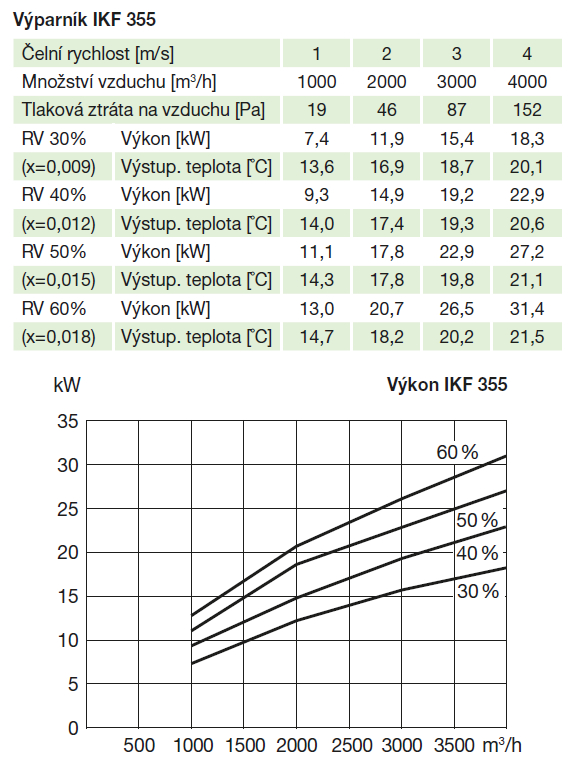 výparná teplota chladiva (výpočtová) 5 ˚C, max. čelní rychlost vzduchu 4 m/s, hodnoty výkonu platí pro přívodní vzduch 32 ˚C, RV 40%, chladivo R410 a R32