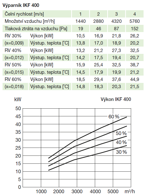 výparná teplota chladiva (výpočtová) 5 ˚C, max. čelní rychlost vzduchu 4 m/s, hodnoty výkonu platí pro přívodní vzduch 32 ˚C, RV 40%, chladivo R410 a R32