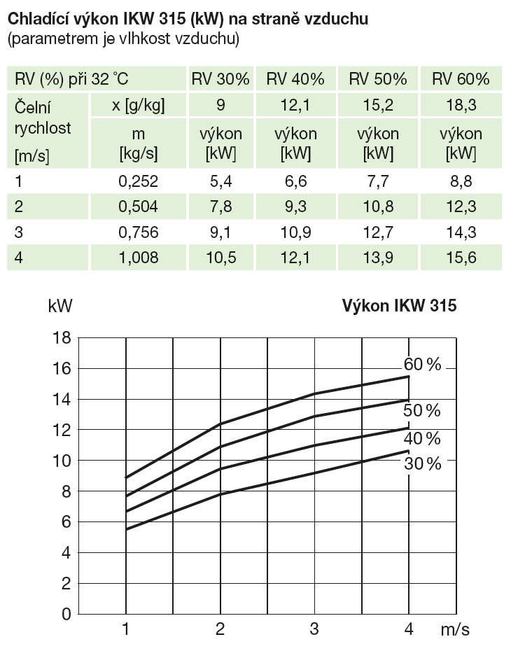 hodnoty výkonu platí pro přívodní vzduch 32 ˚C, RV 40%, teplotní spád vody 6/12 ˚C, čelní rychlost 4 m/s