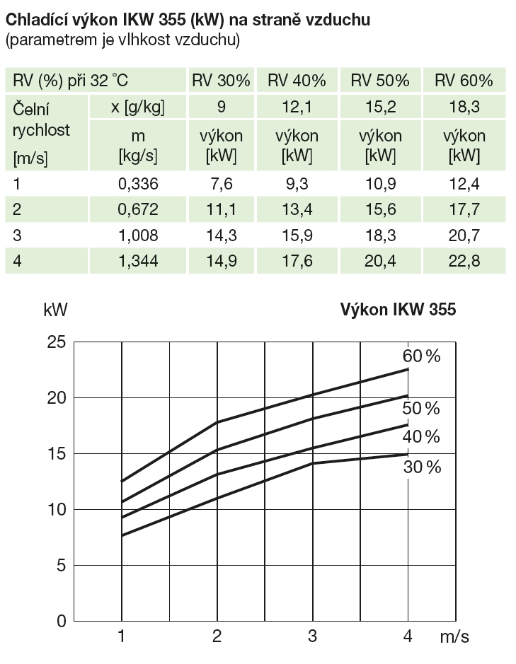 hodnoty výkonu platí pro přívodní vzduch 32 ˚C, RV 40%, teplotní spád vody 6/12 ˚C, čelní rychlost 4 m/s