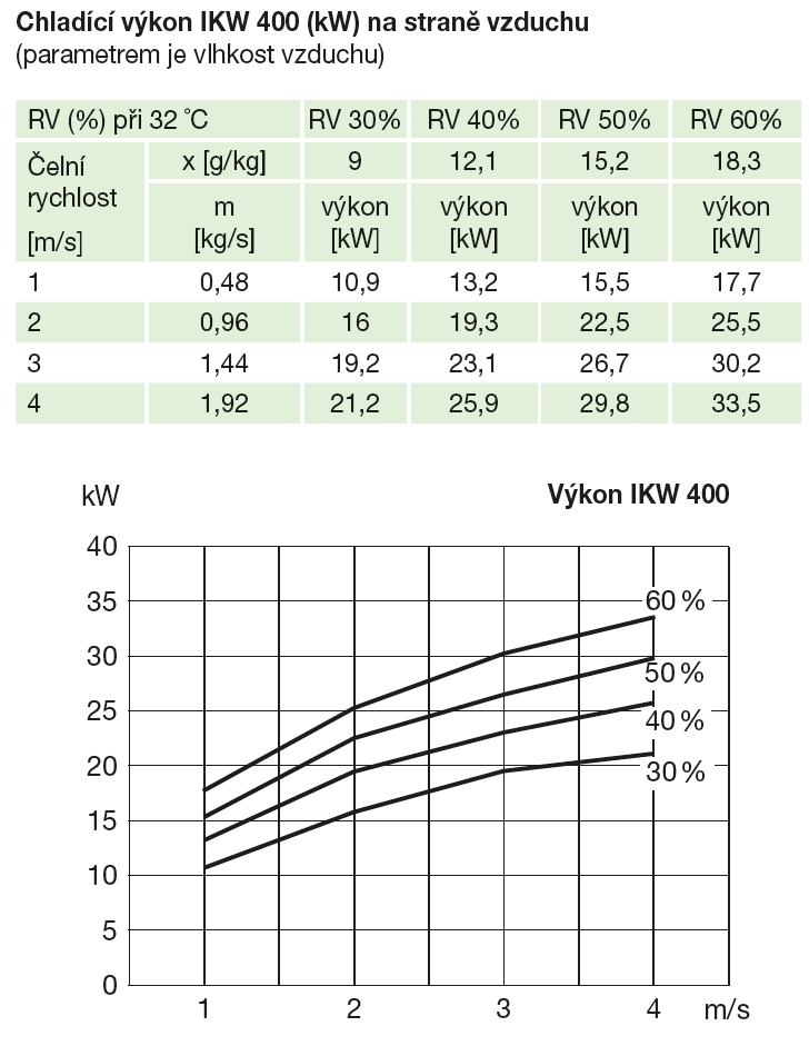 hodnoty výkonu platí pro přívodní vzduch 32 ˚C, RV 40%, teplotní spád vody 6/12 ˚C, čelní rychlost 4 m/s