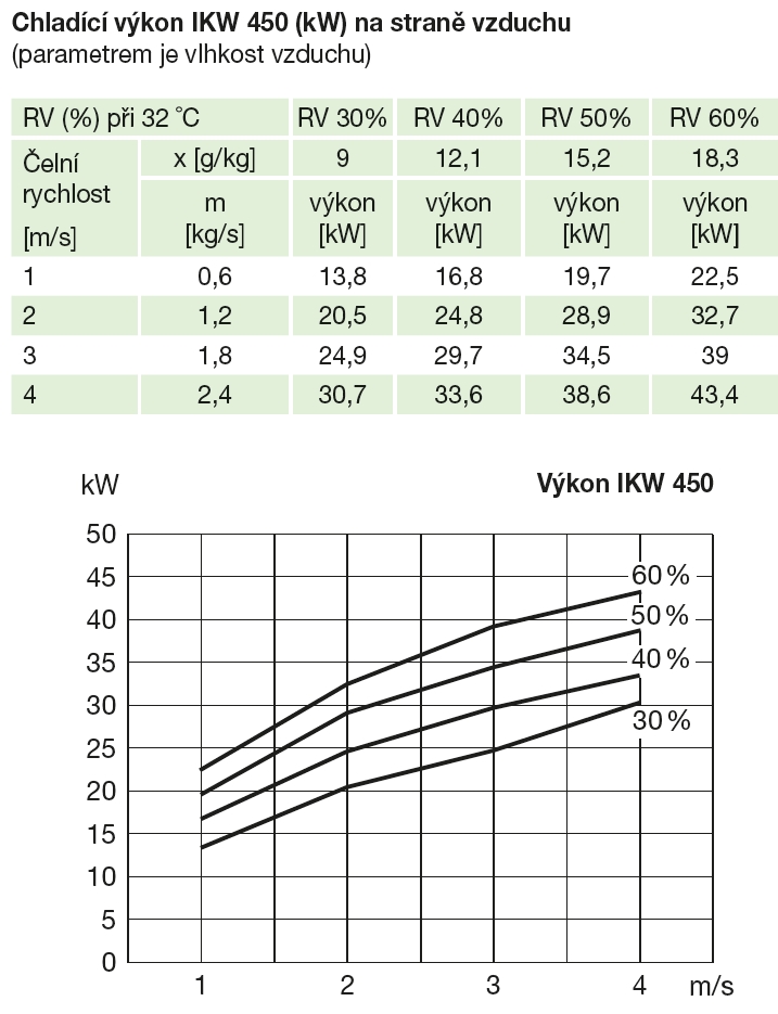 hodnoty výkonu platí pro přívodní vzduch 32 ˚C, RV 40%, teplotní spád vody 6/12 ˚C, čelní rychlost 4 m/s