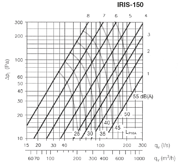 ![]() | Informace Regulační a měřící clona IRIS je ideální zařízení pro regulaci a měření průtoku vzduchu v kruhovém potrubí. • nízká hladina hluku • možnost plného otevření při čištění potrubí • těsná konstrukce Konstrukce Clona IRIS je vyrobena z pozinkovaného ocelového plechu, dodává se s ovládacím mechanismem, měřící stupnicí a odběry pro připojení manometru. Instalace Clona IRIS se k potrubí připojuje pomocí nýtů nebo samořezných šroubů. Připojovací hrdla jsou opatřena jednobřitým těsněním. Bližší informaci ohledně doporučovaných bezpečných vzdáleností viz následující strana. Regulace a měření Clona IRIS může být snadno použita pro měření průtoku vzduchu. Přesný ovládací mechanismus zaručuje definované rozměry otevření odpovídající měřící stupnici. Každá clona je opatřena odběry pro připojení manometru pro měření tlakové diference (pm), která se dá přímo použít k odečtení rychlosti proudění z pracovních charakteristik uvedených na cloně nebo v tištěném podkladu dodávaném s clonou. Diagramy uvedené zde v katalogu jsou určeny pro volbu vhodné velikosti clony, ne pro stanovení průtoku. Průtok vzduchu se dá snadno regulovat pomocí ovládací rukojeti (u velikostí 80–315) nebo pootočením regulační matice (u velikostí 400, 500). | |