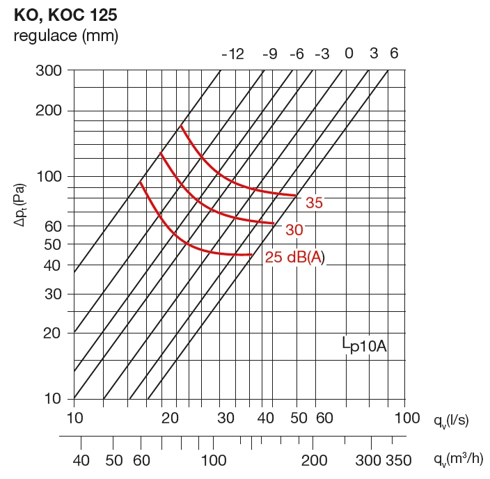 ![]() | Informace Ventil má těsnění z pěnové hmoty. Nastavení průtoku se provádí otáčením regulačního kuželu do požadované polohy a zajištěním v poloze kontramatkou. Montážní kroužek je vyroben z galvanizované oceli a je součástí dodávky talířového ventilu. • pro odvod vzduchu • vhodný do domácností, kanceláří apod. • upevnění na strop • dobré nastavovací parametry • nízká hladina hluku • rychlá a snadná instalace • snadné měření průtoku vzduchu Instalace: Montážní kroužek se připevňuje k potrubí pomocí šroubu nebo nýtu. Zajištění ventilu se provede „zašroubováním“ do závitu v montážním kroužku. Měření a regulace: Regulace průtoku vzduchu se provádí otáčením středového disku, kterým se změní nastavovací rozměr s (mm). Měření průtoku vzduchu se provádí jako měření diference tlaku za použití měřící trubice. Bližší informace viz diagramy průtoku. Vysvětlivky: Talířový ventil KO je v lakovaném provedení. Talířový ventil KOC je v lesklém chromovém provedení. Poznámka Talířové ventily KO jsou k dispozici v provedení pod označením KEL 100, KEL 125 s elektrickým ovládáním 12 V pro zónové větrání. Součástí je bezpečnostní transformátor s časovým doběhem CTE 12/708.