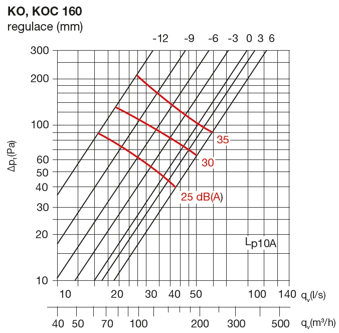 ![]() | Informace Ventil má těsnění z pěnové hmoty. Nastavení průtoku se provádí otáčením regulačního kuželu do požadované polohy a zajištěním v poloze kontramatkou. Montážní kroužek je vyroben z galvanizované oceli a je součástí dodávky talířového ventilu. • pro odvod vzduchu • vhodný do domácností, kanceláří apod. • upevnění na strop • dobré nastavovací parametry • nízká hladina hluku • rychlá a snadná instalace • snadné měření průtoku vzduchu Instalace: Montážní kroužek se připevňuje k potrubí pomocí šroubu nebo nýtu. Zajištění ventilu se provede „zašroubováním“ do závitu v montážním kroužku. Měření a regulace: Regulace průtoku vzduchu se provádí otáčením středového disku, kterým se změní nastavovací rozměr s (mm). Měření průtoku vzduchu se provádí jako měření diference tlaku za použití měřící trubice. Bližší informace viz diagramy průtoku. Vysvětlivky: Talířový ventil KO je v lakovaném provedení. Talířový ventil KOC je v lesklém chromovém provedení. Poznámka Talířové ventily KO jsou k dispozici v provedení pod označením KEL 100, KEL 125 s elektrickým ovládáním 12 V pro zónové větrání. Součástí je bezpečnostní transformátor s časovým doběhem CTE 12/708.