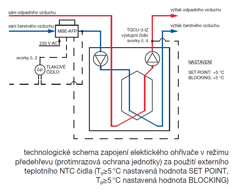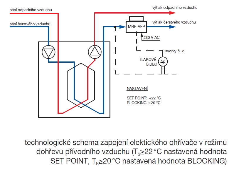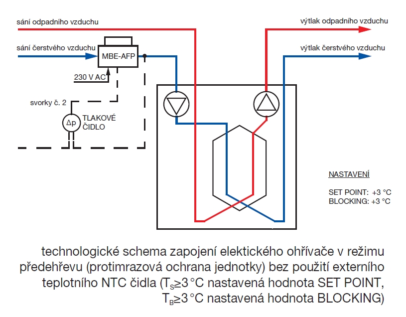 ![]() | Informace Ohřívač MBE AFP lze velmi jednoduše použít pro dohřev přívodního čerstvého vzduchu. Pokud nepostačuje nastavení výstupní teploty interním potenciometrem, je možno použít prostorový nástěnný termostat s rozpínacím kontaktem, který při dosažení prostorové teploty zablokuje provoz ohřívače. Při poklesu prostorové teploty naopak termostat provoz ohřívače odblokuje. | |