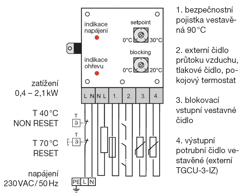 ![]() | Regulace • regulátor je napájen přímo z rozvodné sítě 230 VAC / 50 Hz • výstupní teplota je plynule řízena 0–100%, interně lze nastavit potenciometrem 0–30 °C • regulátor umožňuje připojení externího kanálového čidla (třída elektrické izolace II.), které snímá aktuální teplotu vzduchu za ohřívačem nebo rekuperátorem • je možné blokovat ohřívač, když vstupní teplota dosáhne nastavené hodnoty 0–20 °C • je možné blokovat ohřívač připojením externího čidla průtoku vzduchu, tlakového čidla, pokojového termostatu atd. | |