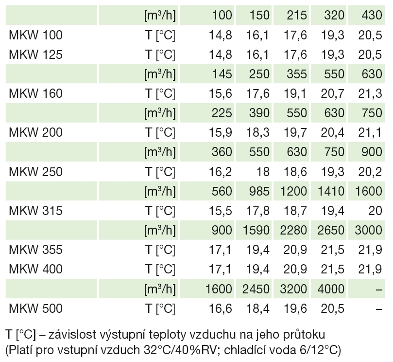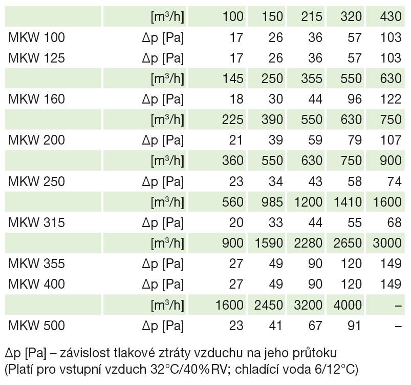 závislost tlakové ztráty vzduchu na jeho průtoku | závislost výstupní teploty vzduchu na jeho průtoku | závislost chladícího výkonu na průtoku vzduchu | technické parametry | |||