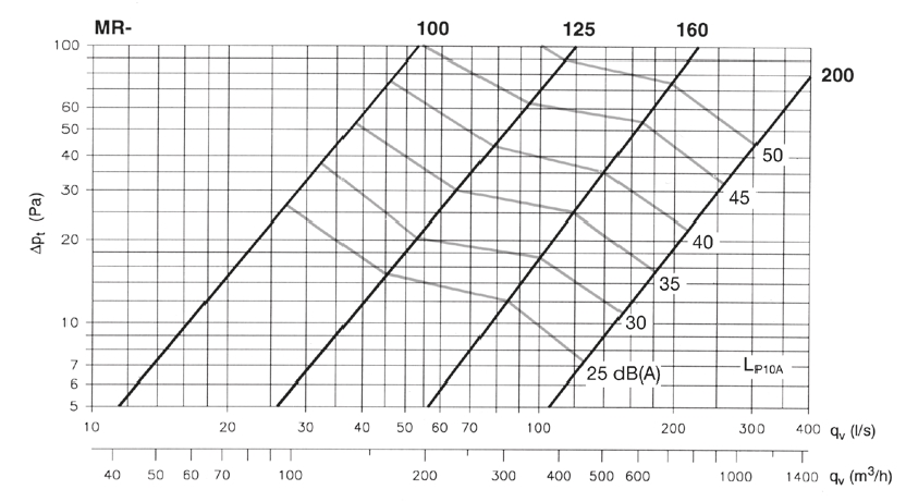 ![]() | Informace Měřící kruh MR je určen pro rychlá a přesná měření průtoku vzduchu pro kruhová potrubí. • funguje nezávisle na směru proudění vzduchu • pevná konstrukce • snadné čištění potrubí u verze s revizními dvířky Konstrukce Skříň měřícího kruhu MR je vyrobena z pozinkovaného ocelového plechu, měřící kruh a odběry pro připojení manometru jsou vyrobeny z hliníku. Revizní dvířka NTL jsou vyrobena z pozinkovaného plechu. Velikosti 100 ... 400 se dodávají s jednobřitým těsněním. Instalace Měřící kruh MR je k potrubí připojen pomocí nýtů nebo samořezných šroubů. Bližší informaci ohledně doporučovaného umístění v potrubním systému viz následující strana. Měření průtoku vzduchu MR je opatřen vývody pro připojení manometru pro měření tlakového rozdílu (pm), který se dá přímo použít k výpočtu hodnot průtoku vzduchu za použití hodnot konstanty k a korekčního faktoru X. Diagramy zde uvedené slouží pro volbu vhodné velikosti při uvažování tlakové ztráty pt. | |