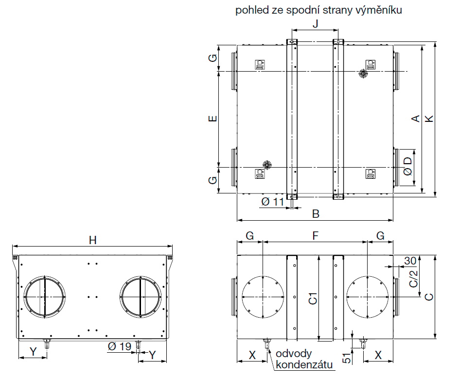 ![]() | Skříň Skříň je z pozinkovaného plechu s kruhovými hrdly na čelních stranách rekuperátoru. Na bočních stranách rekuperátoru jsou demontovatelné kruhové kryty, které je možné s kruhovými hrdly dle potřeby zaměnit. Na dně rekuperátoru na odpadní větvi jsou instalovány odvody kondenzátu (odvod kondenzátu na straně vzduchu před rekuperací lze zaslepit). | |