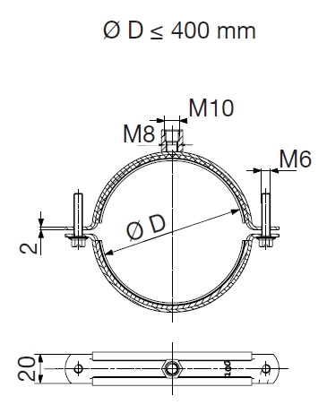 ![]() | Informace • s gumovou výplní pro tlumení vibrací (EPDM) nebo bez gumy • k upevnění kruhového potrubí nebo flexibilních hadic • příprava pro závitovou tyč v horní části objímky pouze do velikosti 400 včetně, pro větší průměry se zavěšení objímky provádí na dvě závitové tyče přes spojovací matice na bocích objímky | |