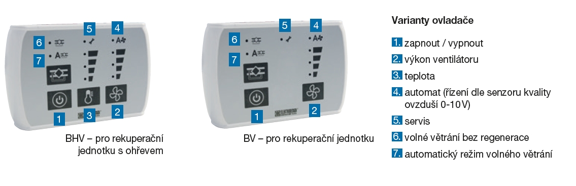 ![]() | Regulace Vestavná digitální regulace pro připojení Plug & Play. Snadné připojení kabelového ovladače konektorem RJ12. Teplotní čidla jsou umístěna na sání, přívodu a odvodu a sání odpadního vzduchu. Funkce volného vychlazování je řešena vypnutím otáčení rotačního regeneračního výměníku. Vstupní klapka je řízena (klapka není součástí dodávky). Komunikace probíhá přes dálkový ovladač s možností ovládání otáček ventilátoru a výkonu elektrického ohřívače. | |