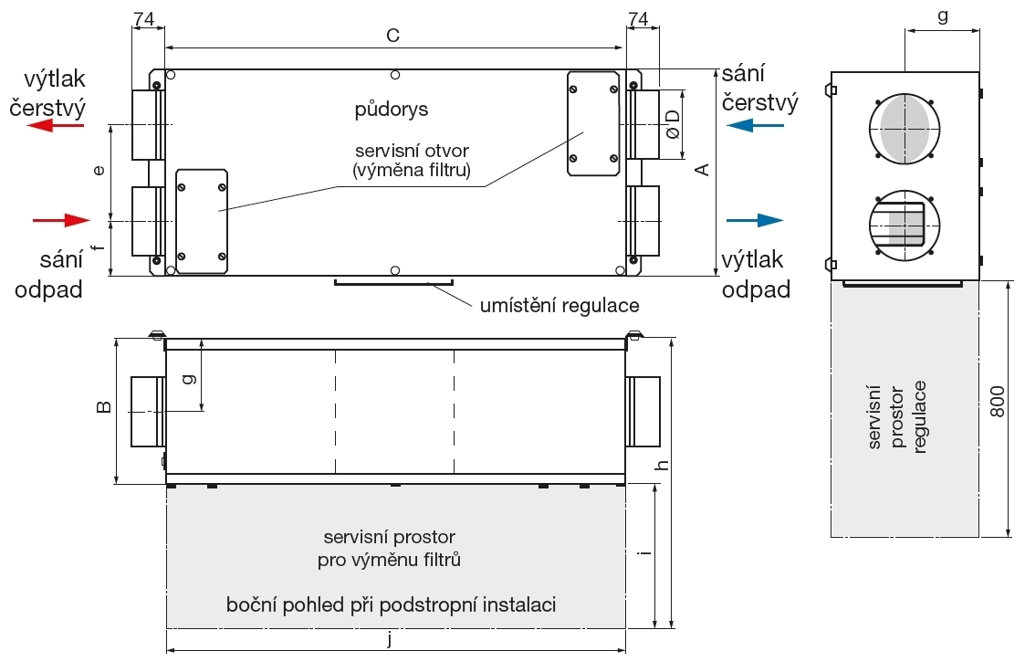 ![]() | Montáž Montáž v horizontální poloze s hrdly vedle sebe. U jednotky je třeba mít manipulační prostor pro vyjmutí filtrů a pro provádění periodických revizí. | |