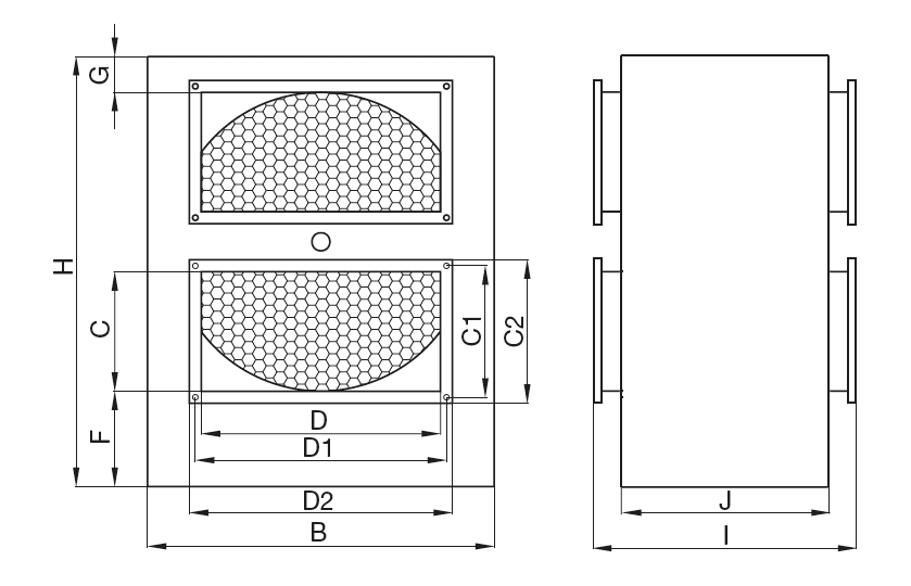 ![]() | Skříň Skříň výměníku je z ocelového, galvanicky pozinkovaného plechu. Na čelech skříně jsou příruby pro upevnění přívodního a odtahového čtyřhranného porubí. Na boku skříně je revizní víko pro přístup k motoru nebo výměnu řemene. | |