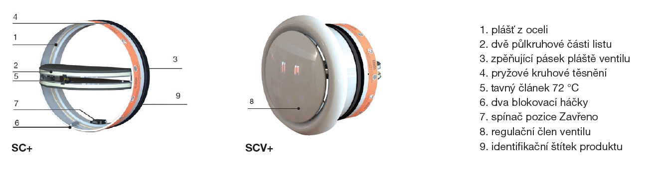 ![]() | Varianty • požární klapka opatřená talířovým ventilem (typ SCV+) • samostatná požární klapka bez talířového ventilu (typ SC+) • požární klapka klasifikovaná dle ČSN EN 13 501 pouze na celistvost (E). Typové označení je SC0/SCV0. Tato varianta je určena pro odvod. Tavná pojistka FT SC je výměnná a lze jí objednat jako příslušenství. Jako příslušenství lze dodat také koncový spínač pozice FCU SC. | |