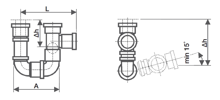 ![]() | Informace Plastový podtlakový sifon s kuličkovým uzávěrem je vhodný pro připojení odvodu kondenzátu vzduchotechnických jednotek a dalších zařízení. Sifon je nastavitelný vysunutím jednotlivých dílů mezi sebou. Délku sifonu „A“, respektive „L“, lze prodloužit vložením prodlužovacího dílu až do 1 metru délky. Vysunutí sifonu Δh se určí dle hodnoty podtlaku v jednotce ze vztahu: Δh = Δp / 10 + 10 [mm], kde Δp je absolutní hodnota rozdílu tlaku v daném místě jednotky při maximálním provozním stavu za atmosférického tlaku. Pro stanovení tlakových rozdílů Δp se uvažuje zanesení filtrů na dvojnásobnou hodnotu tlakové ztráty oproti hodnotě při čistých filtrech. | |