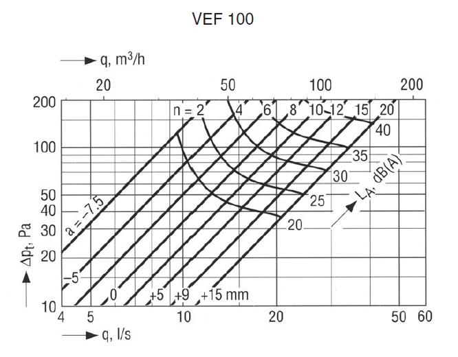 ![]() | Informace Plastové talířové ventily pro odvod vzduchu mají snadno nastavitelný středový element pro regulaci průtoku. Talířový ventil je opatřen těsnicí páskou pro utěsnění v montážním kroužku. Plastové ventily je možné čistit slabými roztoky neagresivních saponátů. Ventily VEF jsou vyrobeny z polypropylenu, barva bílá. Odolávají některým zředěným chemikáliím. Velmi výhodný aerodynamický tvar snižuje hluk ventilu a významně snižuje riziko přeslechového hluku. Montážní rámečky jsou z pozinkovaného plechu. • pro odvod vzduchu vhodný do domácností, kanceláří apod. • dobré nastavovací parametry • nízká hladina hluku • rychlá a snadná instalace • snadné měření průtoku vzduchu • nízká tlaková ztráta • teplota okolí do 100 ˚C • odolnost proti některým chemikáliím Instalace Ventily se zasunují pomocí plochých pružin do zděře VLZ, která umožňuje upevnění ventilu do stropní konstrukce nebo do zdi. Z jedné strany zděře se zasouvá talířový ventil, z druhé strany se nasadí ohebná flexohadice a spoj se upevní pomocí ocelové nebo nylonové upínací pásky. Zděř lze upevnit i do kruhového potrubí. Měření a regulace Regulace průtoku vzduchu se provádí otáčením středového disku, kterým se mění otevření ventilu „a“ (mm). Měření průtoku vzduchu se provádí jako měření diference tlaků za použití měřicí trubice. Bližší informace viz diagramy. Závislost průtoku a tlakové ztráty na otevření ventilu „a“ je vyjádřena vztahem: q = k √Δpm (l/s),(Pa) V grafech je n = počet otáček disku a a = otevření ventilu (mm). | |