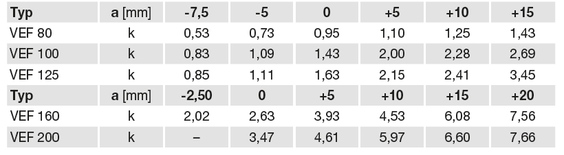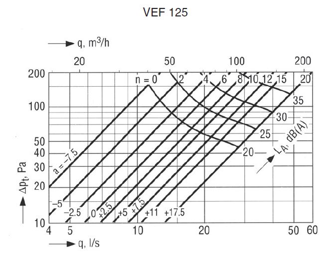 ![]() | Informace Plastové talířové ventily pro odvod vzduchu mají snadno nastavitelný středový element pro regulaci průtoku. Talířový ventil je opatřen těsnicí páskou pro utěsnění v montážním kroužku. Plastové ventily je možné čistit slabými roztoky neagresivních saponátů. Ventily VEF jsou vyrobeny z polypropylenu, barva bílá. Odolávají některým zředěným chemikáliím. Velmi výhodný aerodynamický tvar snižuje hluk ventilu a významně snižuje riziko přeslechového hluku. Montážní rámečky jsou z pozinkovaného plechu. • pro odvod vzduchu vhodný do domácností, kanceláří apod. • dobré nastavovací parametry • nízká hladina hluku • rychlá a snadná instalace • snadné měření průtoku vzduchu • nízká tlaková ztráta • teplota okolí do 100 ˚C • odolnost proti některým chemikáliím Instalace Ventily se zasunují pomocí plochých pružin do zděře VLZ, která umožňuje upevnění ventilu do stropní konstrukce nebo do zdi. Z jedné strany zděře se zasouvá talířový ventil, z druhé strany se nasadí ohebná flexohadice a spoj se upevní pomocí ocelové nebo nylonové upínací pásky. Zděř lze upevnit i do kruhového potrubí. Měření a regulace Regulace průtoku vzduchu se provádí otáčením středového disku, kterým se mění otevření ventilu „a“ (mm). Měření průtoku vzduchu se provádí jako měření diference tlaků za použití měřicí trubice. Bližší informace viz diagramy. Závislost průtoku a tlakové ztráty na otevření ventilu „a“ je vyjádřena vztahem: q = k √Δpm (l/s),(Pa) V grafech je n = počet otáček disku a a = otevření ventilu (mm). | |
