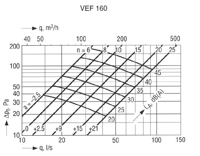 ![]() | Informace Plastové talířové ventily pro odvod vzduchu mají snadno nastavitelný středový element pro regulaci průtoku. Talířový ventil je opatřen těsnicí páskou pro utěsnění v montážním kroužku. Plastové ventily je možné čistit slabými roztoky neagresivních saponátů. Ventily VEF jsou vyrobeny z polypropylenu, barva bílá. Odolávají některým zředěným chemikáliím. Velmi výhodný aerodynamický tvar snižuje hluk ventilu a významně snižuje riziko přeslechového hluku. Montážní rámečky jsou z pozinkovaného plechu. • pro odvod vzduchu vhodný do domácností, kanceláří apod. • dobré nastavovací parametry • nízká hladina hluku • rychlá a snadná instalace • snadné měření průtoku vzduchu • nízká tlaková ztráta • teplota okolí do 100 ˚C • odolnost proti některým chemikáliím Instalace Ventily se zasunují pomocí plochých pružin do zděře VLZ, která umožňuje upevnění ventilu do stropní konstrukce nebo do zdi. Z jedné strany zděře se zasouvá talířový ventil, z druhé strany se nasadí ohebná flexohadice a spoj se upevní pomocí ocelové nebo nylonové upínací pásky. Zděř lze upevnit i do kruhového potrubí. Měření a regulace Regulace průtoku vzduchu se provádí otáčením středového disku, kterým se mění otevření ventilu „a“ (mm). Měření průtoku vzduchu se provádí jako měření diference tlaků za použití měřicí trubice. Bližší informace viz diagramy. Závislost průtoku a tlakové ztráty na otevření ventilu „a“ je vyjádřena vztahem: q = k √Δpm (l/s),(Pa) V grafech je n = počet otáček disku a a = otevření ventilu (mm). | |