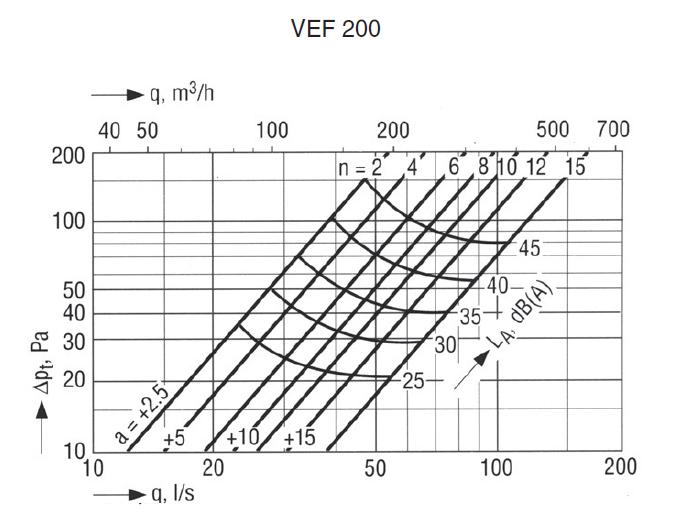 ![]() | Informace Plastové talířové ventily pro odvod vzduchu mají snadno nastavitelný středový element pro regulaci průtoku. Talířový ventil je opatřen těsnicí páskou pro utěsnění v montážním kroužku. Plastové ventily je možné čistit slabými roztoky neagresivních saponátů. Ventily VEF jsou vyrobeny z polypropylenu, barva bílá. Odolávají některým zředěným chemikáliím. Velmi výhodný aerodynamický tvar snižuje hluk ventilu a významně snižuje riziko přeslechového hluku. Montážní rámečky jsou z pozinkovaného plechu. • pro odvod vzduchu vhodný do domácností, kanceláří apod. • dobré nastavovací parametry • nízká hladina hluku • rychlá a snadná instalace • snadné měření průtoku vzduchu • nízká tlaková ztráta • teplota okolí do 100 ˚C • odolnost proti některým chemikáliím Instalace Ventily se zasunují pomocí plochých pružin do zděře VLZ, která umožňuje upevnění ventilu do stropní konstrukce nebo do zdi. Z jedné strany zděře se zasouvá talířový ventil, z druhé strany se nasadí ohebná flexohadice a spoj se upevní pomocí ocelové nebo nylonové upínací pásky. Zděř lze upevnit i do kruhového potrubí. Měření a regulace Regulace průtoku vzduchu se provádí otáčením středového disku, kterým se mění otevření ventilu „a“ (mm). Měření průtoku vzduchu se provádí jako měření diference tlaků za použití měřicí trubice. Bližší informace viz diagramy. Závislost průtoku a tlakové ztráty na otevření ventilu „a“ je vyjádřena vztahem: q = k √Δpm (l/s),(Pa) V grafech je n = počet otáček disku a a = otevření ventilu (mm). | |