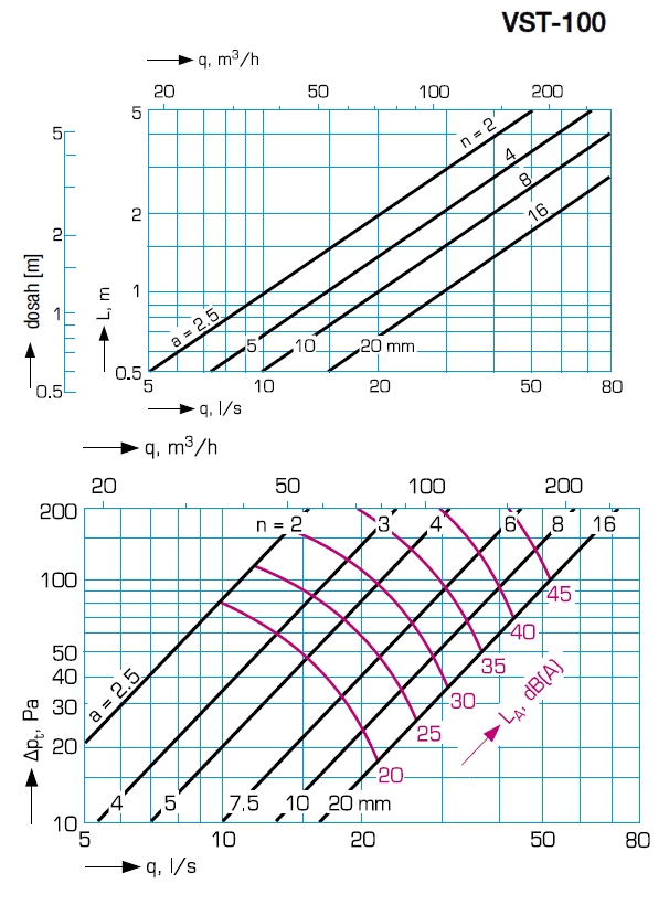 ![]() | Informace Plastové talířové ventily pro přívod vzduchu mají snadno nastavitelný středový element pro regulaci průtoku. Ventil je vybaven otvorem pro měření tlaku. Zároveň je možné talířový ventil vybavit nastavitelným deflektorem, který omezí proud přiváděného vzduchu do prostoru v úhlu 180˚. Talířový ventil je opatřen těsnicí páskou pro utěsnění v montážním kroužku. Plastové ventily je možné čistit slabými roztoky neagresivních saponátů. Ventily VST jsou vyrobeny z polypropylenu, barva bílá. Odolávají některým zředěným chemikáliím. Velmi výhodný aerodynamický tvar snižuje hluk ventilu a významně snižuje riziko přeslechového hluku. • pro přívod vzduchu vhodný do domácností, kanceláří apod. • dobré nastavovací parametry • nízká hladina hluku • rychlá a snadná instalace • snadné měření průtoku vzduchu • nízká tlaková ztráta • teplota okolí do 100 ˚C • odolnost proti některým chemikáliím • možnost vybavení deflektorem Instalace: Ventily se zasunují pomocí plochých pružin do zděře VLZ, která umožňuje upevnění ventilu do stropní konstrukce, zdi nebo potrubí. Z jedné strany zděře se zasouvá talířový ventil, z druhé strany se nasadí ohebná flexohadice a spoj se upevní pomocí ocelové nebo nylonové upínací pásky. Zděř lze upevnit i do kruhového potrubí. Pro potrubí Ø 150 a Ø 160 se použije příslušná zděř VLZ a talířový ventil vždy Ø 160. Měření a regulace: Regulace průtoku vzduchu se provádí otáčením středového disku, kterým se mění otevření ventilu „a“ (mm). Měření průtoku vzduchu se provádí jako měřění diference tlaků za použití měřící trubice. Bližší informace viz diagramy. Závislost průtoku a tlakové ztráty na otevření ventilu „a“ je vyjádřena vztahem: q = k √Δpm (l/s), (Pa) V grafech je n = počet otáček disku a a = otevření ventilu (mm). Dosah je uváděn pro maximální rychlost proudění v = 0,2 m/s. | |