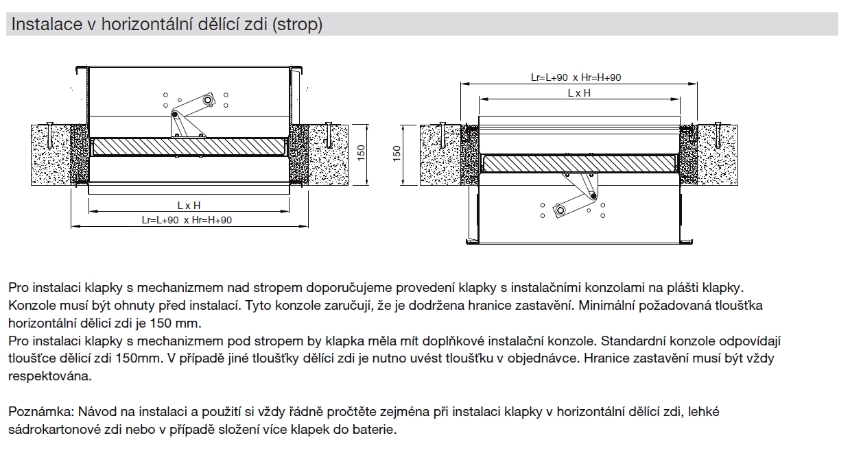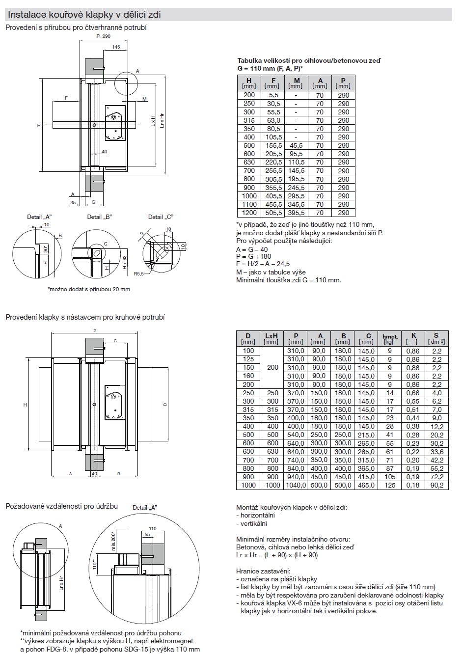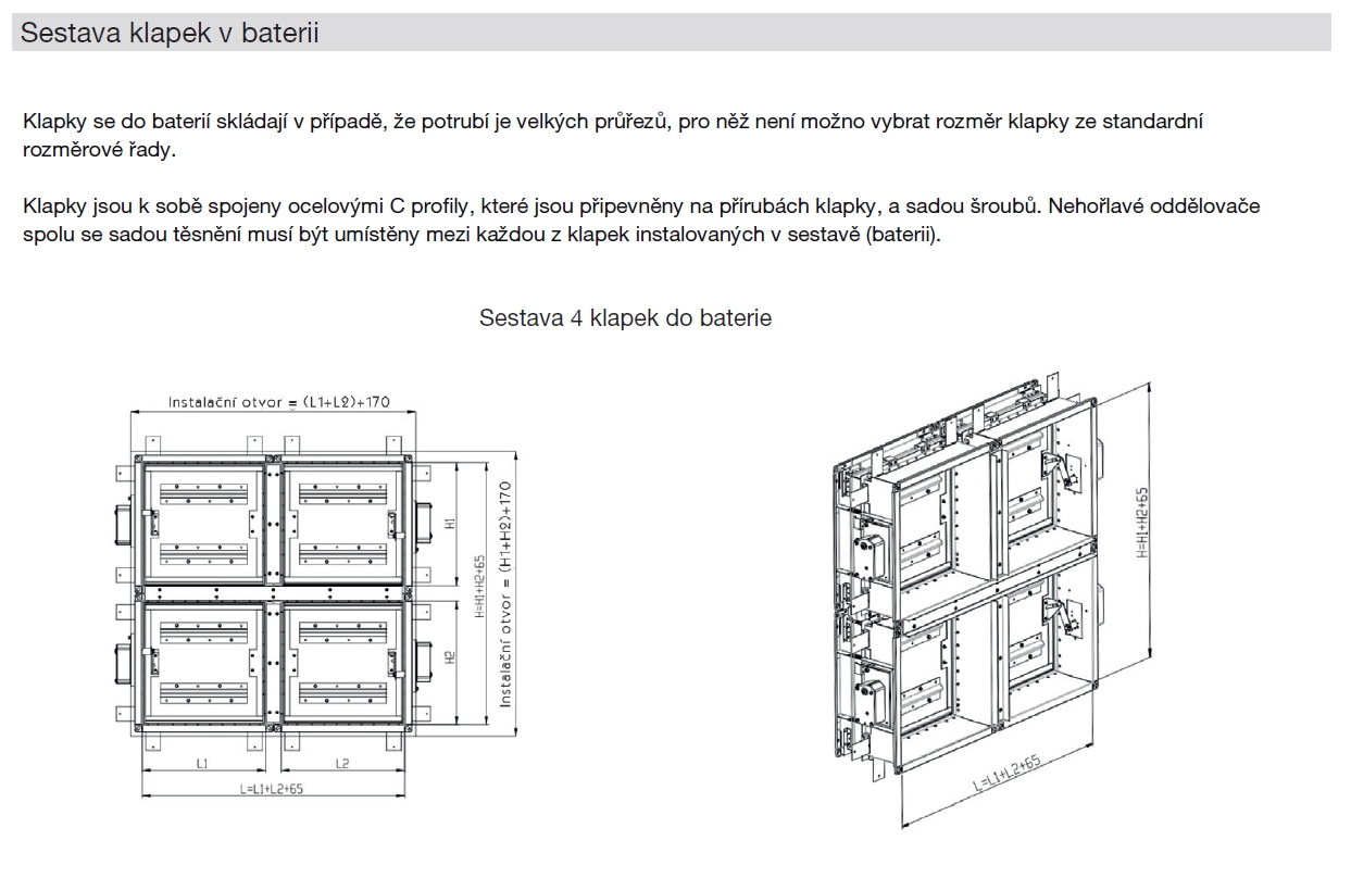 ![]() | Informace Klapky VX-6 jsou určeny pro systémy odvodu tepla a kouře z požárem zasaženého požárního úseku. Klapky jsou certifikovány podle normy ČSN EN 12 101-8 a testovány podle ČSN EN 1366-10. Klasifikace je provedena podle ČSN EN 13501-3+A1:2010. Použití Klapky VX-6 mohou být instalovány v systémech odvodu tepla a kouře z více požárních úseků (multi). Mohou být instalovány jak v systémech OTK, tak i v kombinaci s běžným VZT systémem. Jsou určeny do systémů s automatickou aktivací. Instalace klapek je dovolena do potrubí, které prochází stropem nebo stěnou, nebo přímo do stropu nebo zdi (potrubní trasa tímto prvkem může začínat). Požární odolnost klapek je EI 120 (vewhow i <->o) S 1500Pa C10000 AA multi. Těsnost pláště odpovídá třídě C a listu klapky třídě 4. Testování bylo provedeno v souladu s EN 1751:2002. Popis Klapka se sestává z: • čtyřhranného pláště vyrobeného z pozinkovaného ocelového plechu • pohyblivého listu klapky z požáru odolného materiálu • kouřových a požárních těsnění • kontrolního mechanizmu, alternativně modulu EMS pro vzdálenou kontrolu funkce klapky | |