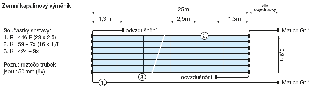 • půdorysné rozměry zemního kapalinového výměníku jsou 25 m x 0,9 m. Zhotoven je z potrubí ze síťovaného polyetylenu systému REVEL-PEX o rozměrech 16 x 1,8 mm s připojením trubkami PEX o rozměrech 23 x 2,5 mm šroubením na vzduchový registr