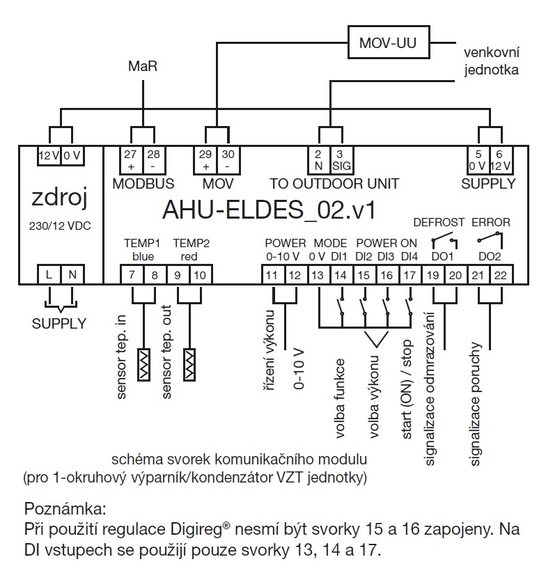 ![]() | Informace • komunikační modul pro ovládání kondenzační jednotky regulací Digireg® používanou v jednotkách DUOVENT® Compact a DUOVENT® Modular • modul AHU-ELDES_02.v1 je rozšířený komunikační box pro jednotky LG UU s možností připojení komunikace Modbus nebo doplňkového Modulu Omezení výkonu (MOV) • modul AHU-ELDES_03.v1 je komunikační box pro jednotky CHIGO COU Moduly AHU-ELDES nezasahují do logiky řízení venkovní kondenzační jednotky. Algoritmy řízení otáček kompresoru, kondenzační/vypařovací teploty a kondenzačního/vypařovacího tlaku na výměníku vnější jednotky jsou obsaženy v softwaru PCB venkovních kondenzačních jednotek. Komunikační box nijak nenahrazuje MaR VZT jednotky. | |