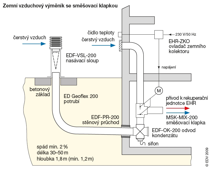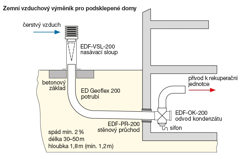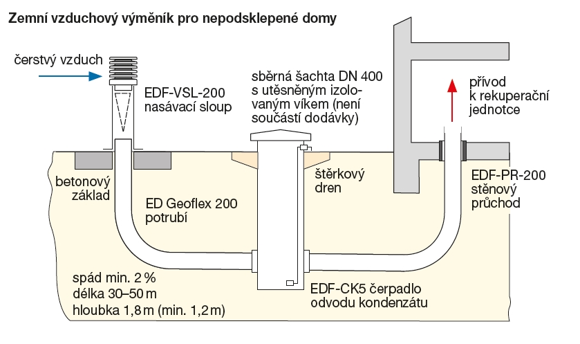 • pro zabezpečení nejvyššího možného přestupu tepla je třeba uložit potrubí zemního výměníku do hloubky 1,8 m (min 1,2 m) v celkové délce 30–45 m při dodržení min spádu potrubí 2% pro odvod kondenzátu ke křížovému kusu se sifonem popř. ke kondenzační