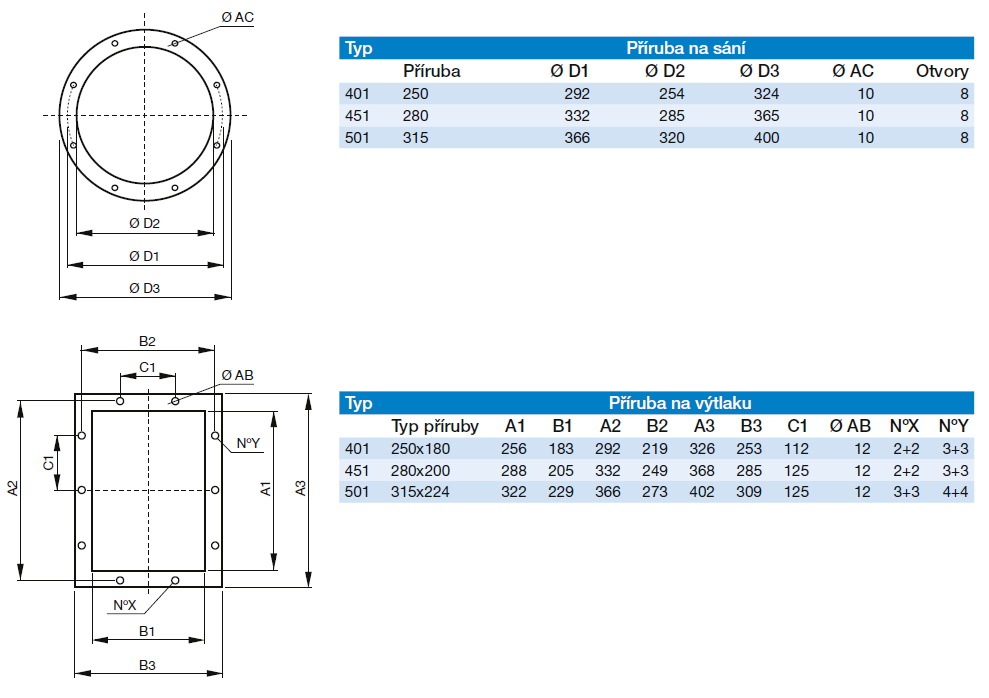 ![]() | Informace Jednostranně sací radiální ventilátor s motorem napřímo. Vyroben z ocelového plechu chráněného kataforezním základním nátěrem a polyuretanovým lakem. Navržen pro trvalý provoz, teplota přepravované vzdušiny od -20 °C do +60 °C. Motory: 2, 4 nebo 6pólové, IE 3* s vysokou účinností, třífázové provedení 230/400 V, 50 Hz do velikosti motoru 132. Pro velikosti motoru nad 132 400/690 V, 50 Hz. Krytí IP55, izolace třídy F. Všechny motory lze regulovat FM. Na vyžádání: • nerez AISI304, AISI316, CORTEN, CREUSABRO 4800 a další materiály • 60 Hz provedení • lakované v různých barvách RAL • ventilátor bez podstavce (provedení 5) do velikosti motoru 160 • vysokoteplotní provedení (až do 220 °C, provedení B s chladicím kotoučem), do 300 °C provedení 8 nebo 12 • ventilátor s pohonem na spojku (provedení 8) nebo na řemen (provedení 12) • revizní dvířka, odvod kondenzátu, ucpávka hřídele, antivibrační sada, nátrubek pro odvod kondenzátu, ochranná mřížka na sání, plynotěsné provedení, provedení s vyšší otěruvzdorností, svařovaná spirální skříň, tepelně izolovaná spirální skříň ATEX provedení: Na vyžádání možnost dodání v nevýbušném provedení podle směrnice ATEX pro třífázové motory a pro okolní atmosférické podmínky definované normou EN 14986. Rozsah teplot -20 °C až +60 °C, absolutní tlak 0,8 až 1,1 bar. • Plyn: 2G IIB T2-T3-T4, motor ExdIIB nebo ExeII 2G IIB+H2 T2-T3-T4, motor ExdIIC 3G IIB T2-T3-T4, motor ExnA (pouze pro zónu 3G) 3G IIB+H2 T2-T3-T4, motor ExnA (pouze pro zónu 3G) • Nevodivý prach: 2D IIIB T125°C-T135°C-T195°CT295°C 3D IIIB T125°C-T135°C-T195°CT295°C • Vodivý prach (povinný motor IP65): 2D IIIC T125°C-T135°C-T195°CT295°C 3D IIIC T125°C-T135°C-T195°CT295°C | |