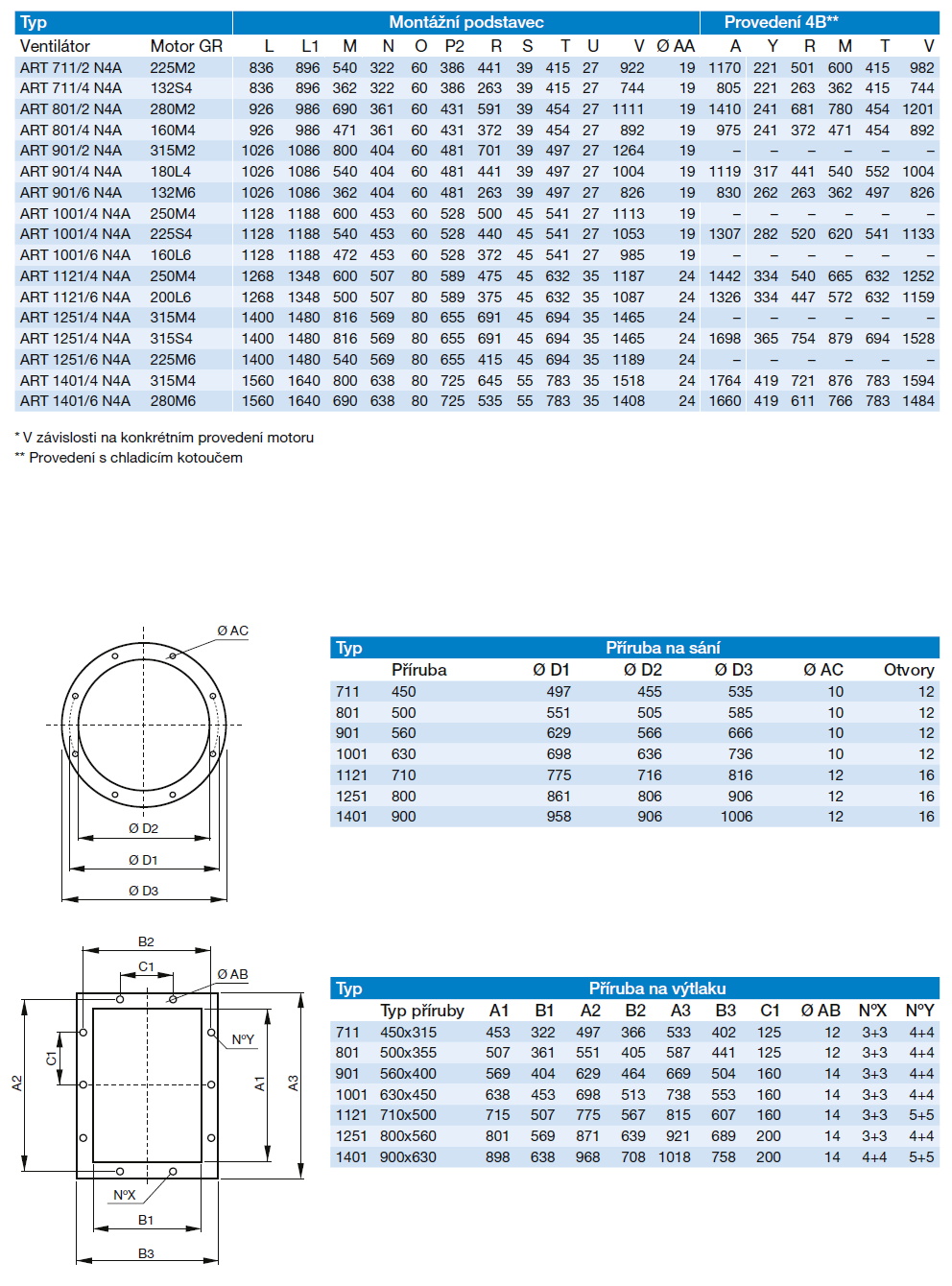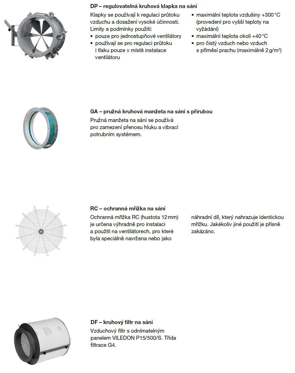 ![]() | Informace Jednostranně sací radiální ventilátor s motorem napřímo. Vyroben z ocelového plechu chráněného kataforezním základním nátěrem a polyuretanovým lakem. Navržen pro trvalý provoz, teplota přepravované vzdušiny od -20 °C do +60 °C. Motory: 2, 4 nebo 6pólové, IE 3* s vysokou účinností, třífázové provedení 230/400 V, 50 Hz do velikosti motoru 132. Pro velikosti motoru nad 132 400/690 V, 50 Hz. Krytí IP55, izolace třídy F. Všechny motory lze regulovat FM. Na vyžádání: • nerez AISI304, AISI316, CORTEN, CREUSABRO 4800 a další materiály • 60 Hz provedení • lakované v různých barvách RAL • ventilátor bez podstavce (provedení 5) do velikosti motoru 160 • vysokoteplotní provedení (až do 220 °C, provedení B s chladicím kotoučem), do 300 °C provedení 8 nebo 12 • ventilátor s pohonem na spojku (provedení 8) nebo na řemen (provedení 12) • revizní dvířka, odvod kondenzátu, ucpávka hřídele, antivibrační sada, nátrubek pro odvod kondenzátu, ochranná mřížka na sání, plynotěsné provedení, provedení s vyšší otěruvzdorností, svařovaná spirální skříň, tepelně izolovaná spirální skříň ATEX provedení: Na vyžádání možnost dodání v nevýbušném provedení podle směrnice ATEX pro třífázové motory a pro okolní atmosférické podmínky definované normou EN 14986. Rozsah teplot -20 °C až +60 °C, absolutní tlak 0,8 až 1,1 bar. • Plyn: 2G IIB T2-T3-T4, motor ExdIIB nebo ExeII 2G IIB+H2 T2-T3-T4, motor ExdIIC 3G IIB T2-T3-T4, motor ExnA (pouze pro zónu 3G) 3G IIB+H2 T2-T3-T4, motor ExnA (pouze pro zónu 3G) • Nevodivý prach: 2D IIIB T125°C-T135°C-T195°CT295°C 3D IIIB T125°C-T135°C-T195°CT295°C • Vodivý prach (povinný motor IP65): 2D IIIC T125°C-T135°C-T195°CT295°C 3D IIIC T125°C-T135°C-T195°CT295°C | |