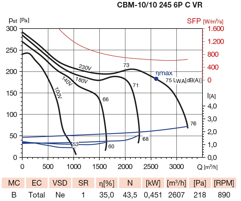| průtok (0 Pa) [m3/h] | ekvivalentní rozměr [mm] | příkon [W] | napětí [V] | proud [A] | max. teplota [°C] | akust. tlak [dB(A)] | hmotnost [kg] | regulátor |