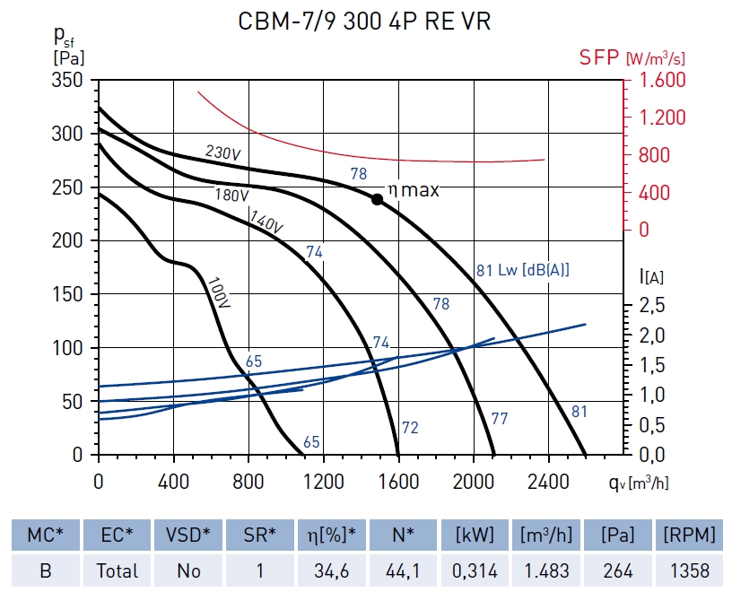 | ekvivalentní rozměr [mm] | příkon [W] | napětí [V] | proud [A] | průtok [m3/h] | max. teplota [°C] | akust. tlak [dB(A)] | hmotnost [kg] | regulátor |