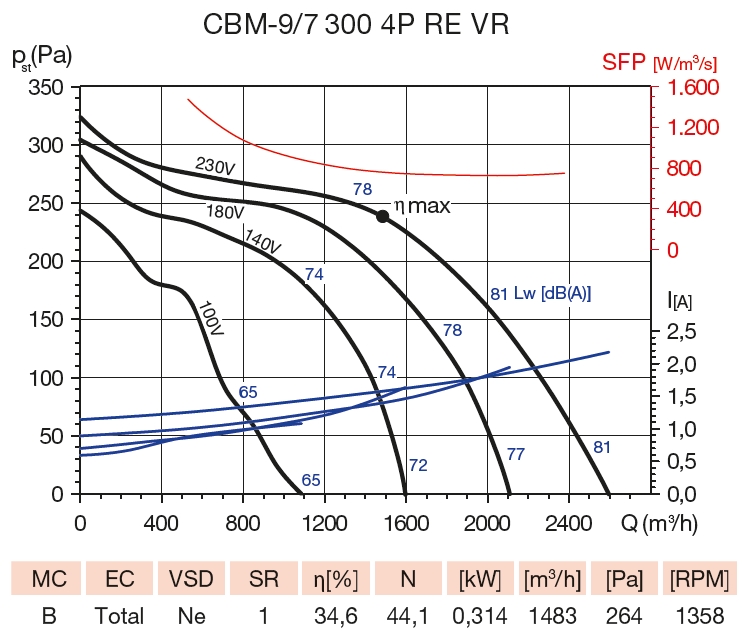 | ekvivalentní rozměr [mm] | příkon [W] | napětí [V] | proud [A] | průtok [m3/h] | max. teplota [°C] | akust. tlak [dB(A)] | hmotnost [kg] | regulátor |
