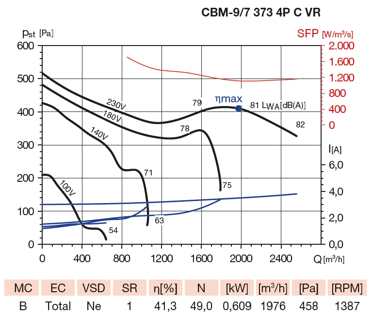 | průtok (0 Pa) [m3/h] | ekvivalentní rozměr [mm] | příkon [W] | napětí [V] | proud [A] | max. teplota [°C] | akust. tlak [dB(A)] | hmotnost [kg] | regulátor |
