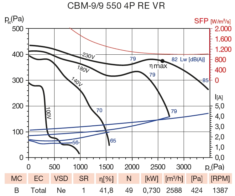 | ekvivalentní rozměr [mm] | příkon [W] | napětí [V] | proud [A] | průtok [m3/h] | max. teplota [°C] | akust. tlak [dB(A)] | hmotnost [kg] | regulátor |