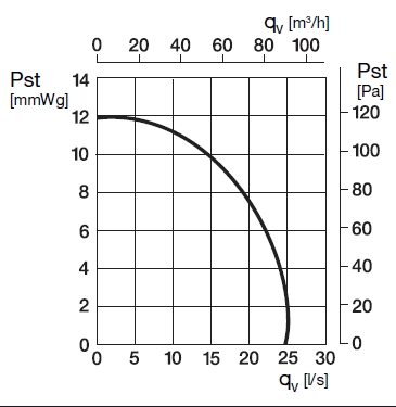 | Otáčky [min-1] | Průtok [0 Pa] [m3/h] | Výkon [W] | Napětí [V] | Max. teplota [˚C] | Ø potrubí [mm] | Akust. tlak [dB(A)] | Hmotnost [kg] | Regulátor |