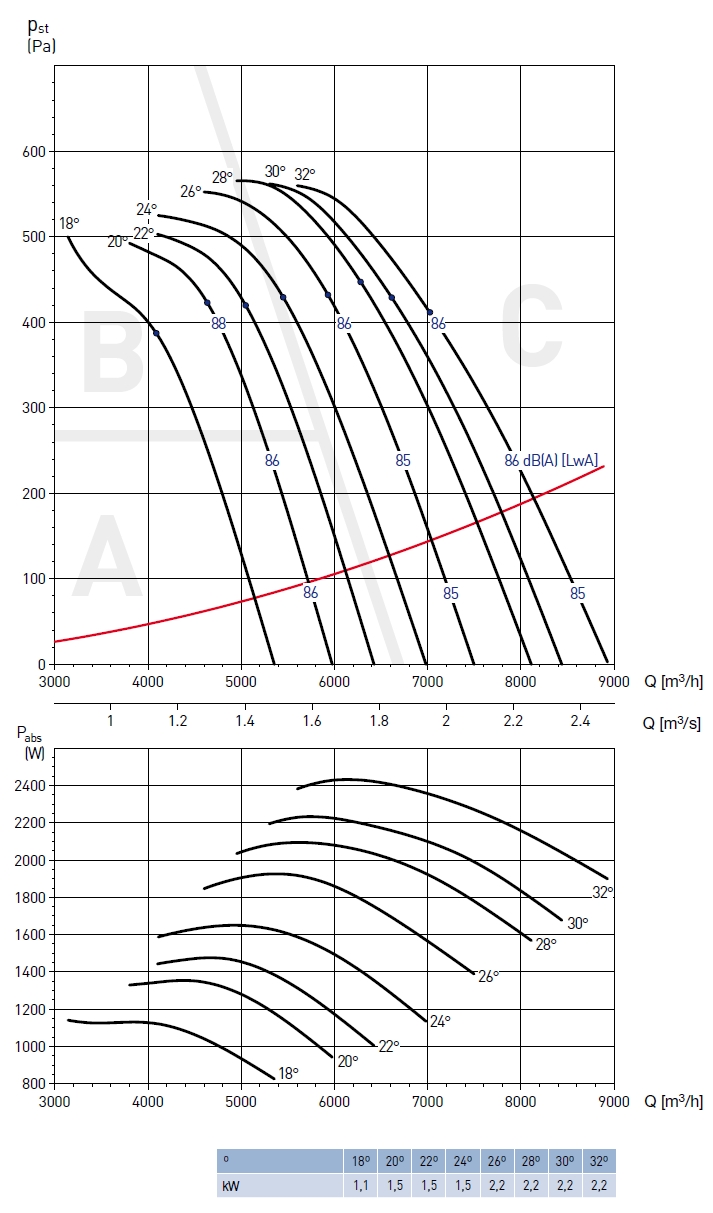![]() | Oběžné kolo Oběžné kolo má lopatky z Al slitiny a náboj z ocelového plechu. Oběžné kolo je staticky i dynamicky vyváženo. Nastavení úhlu listů oběžného kola je provedeno výrobcem. Počet lopatek 3, 6 nebo 9. | |