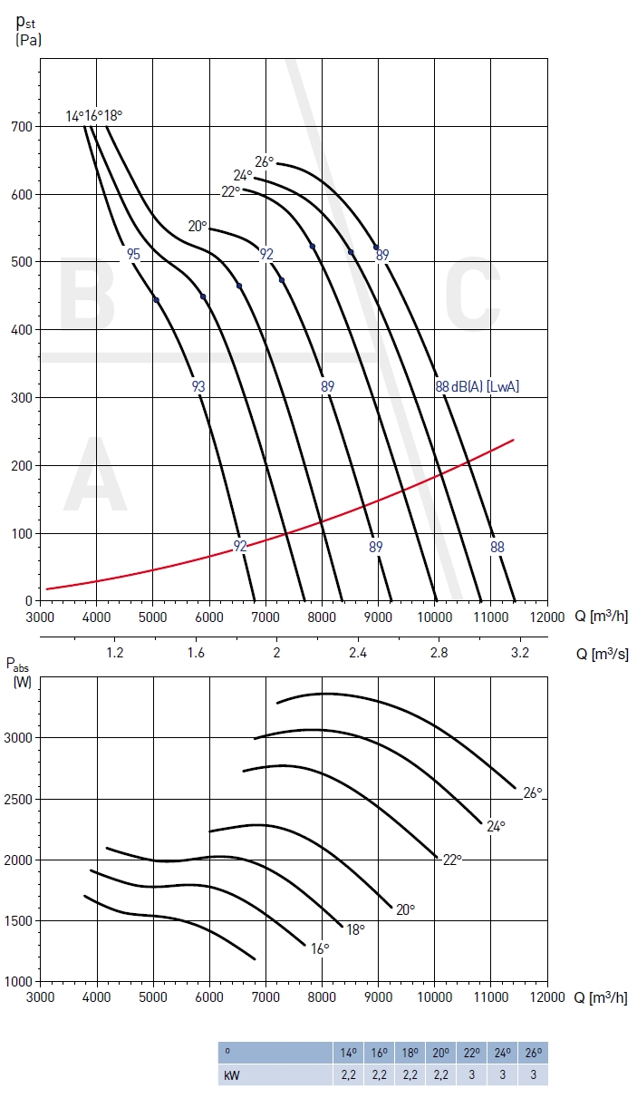 ![]() | Oběžné kolo Oběžné kolo má lopatky z Al slitiny a náboj z ocelového plechu. Oběžné kolo je staticky i dynamicky vyváženo. Nastavení úhlu listů oběžného kola je provedeno výrobcem. Počet lopatek 3, 6 nebo 9. | |
