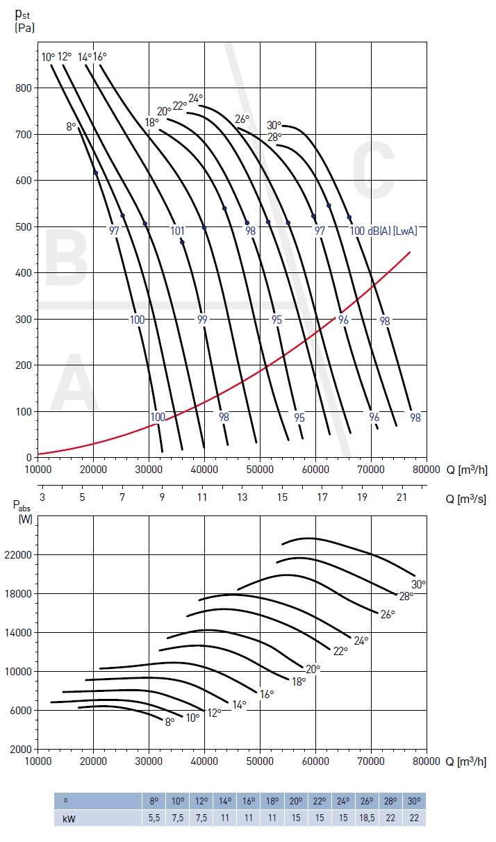 ![]() | Oběžné kolo Oběžné kolo má lopatky z Al slitiny a náboj z ocelového plechu. Oběžné kolo je staticky i dynamicky vyváženo. Nastavení úhlu listů oběžného kola je provedeno výrobcem. Počet lopatek 3, 6 nebo 9. | |
