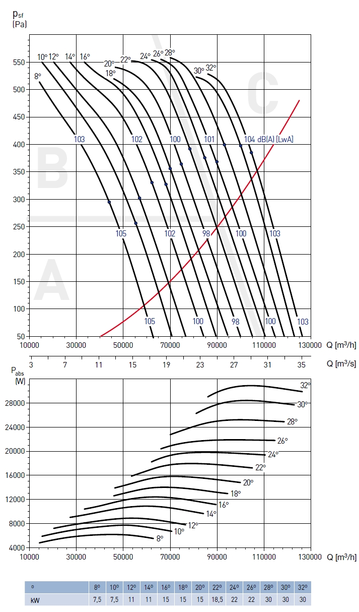 ![]() | Oběžné kolo Oběžné kolo má lopatky z Al slitiny a náboj z ocelového plechu. Oběžné kolo je staticky i dynamicky vyváženo. Nastavení úhlu listů oběžného kola je provedeno výrobcem. Počet lopatek 3, 6 nebo 9. | |
