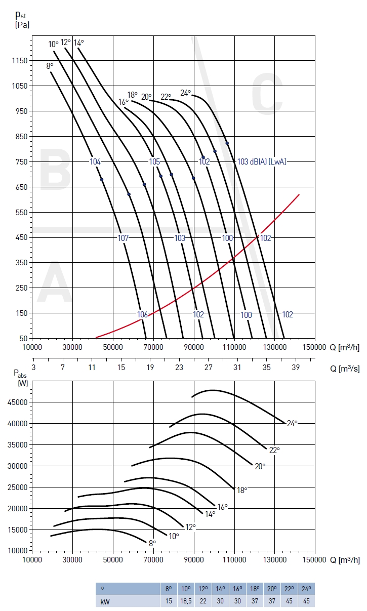 ![]() | Oběžné kolo Oběžné kolo má lopatky z Al slitiny a náboj z ocelového plechu. Oběžné kolo je staticky i dynamicky vyváženo. Nastavení úhlu listů oběžného kola je provedeno výrobcem. Počet lopatek 3, 6 nebo 9. | |