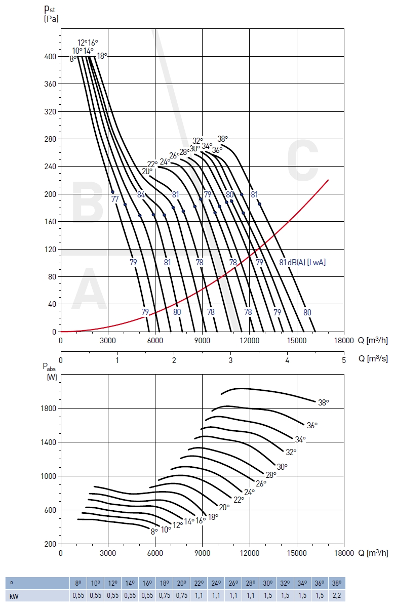 ![]() | Oběžné kolo Oběžné kolo má lopatky z Al slitiny a náboj z ocelového plechu. Oběžné kolo je staticky i dynamicky vyváženo. Nastavení úhlu listů oběžného kola je provedeno výrobcem. Počet lopatek 3, 6 nebo 9. | |